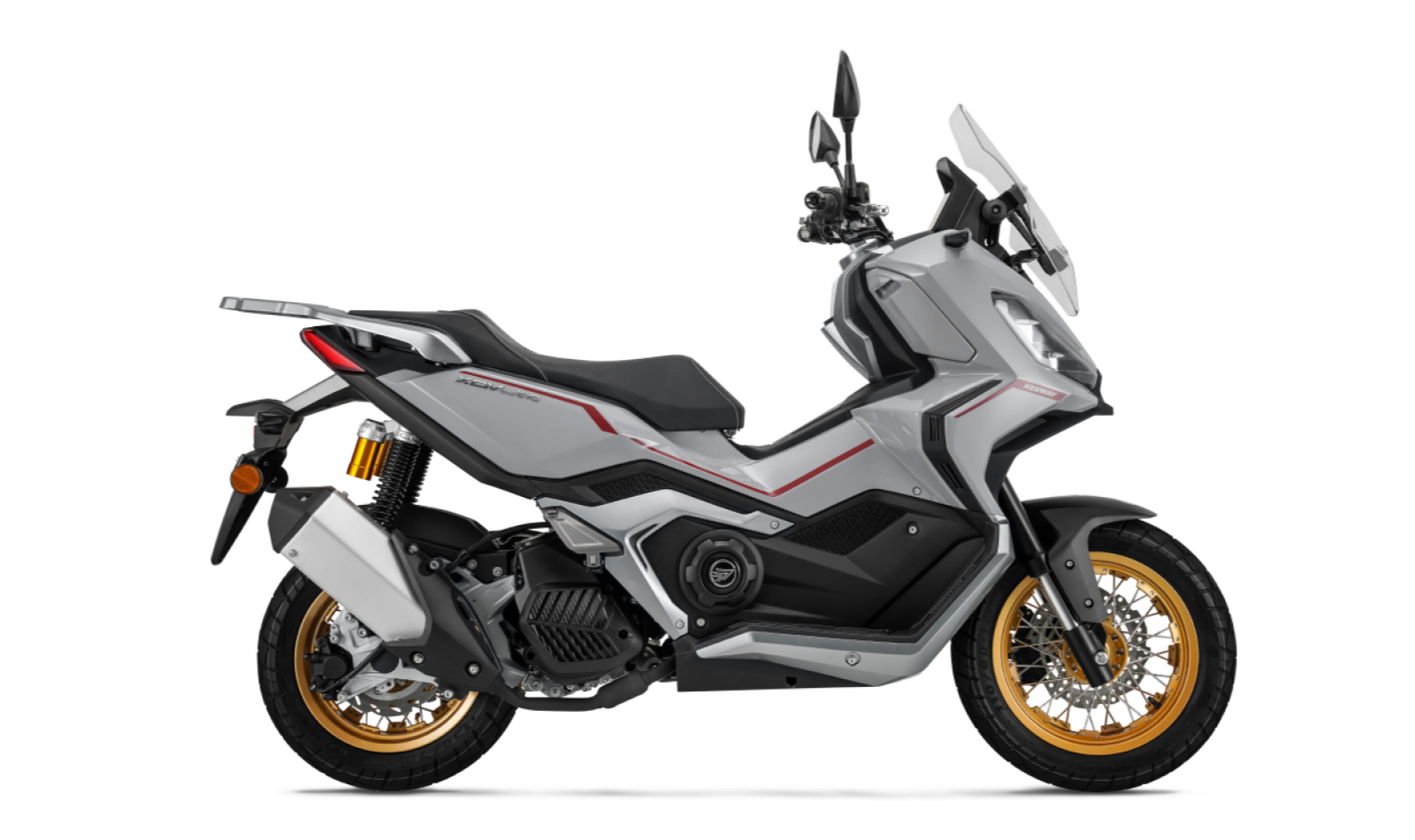 En cuanto a la parte ciclo, incorpora suspensión delantera con horquilla invertida y doble amortiguador trasero ajustable, que, junto con llantas de radios de 14″ y 13″ y neumáticos de uso mixto, ofrece estabilidad y confianza incluso sobre superficies irregulares. El sistema de frenado con discos y ABS añade seguridad en cualquier condición.
